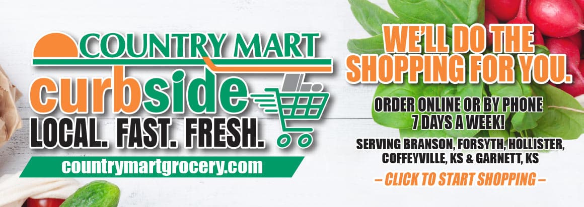 A: Currently we offer Curbside Pickup for online orders at 5 Country Mart stores: 1447 State Hwy 248, Suite J in Branson, MO, 200 SouthTowne Blvd in Hollister, MO, 15720 US Hwy 160 in Forsyth, MO, 1000 Hall Street in Coffeyville, KS, and 425 N. Maple in Garnett, KS.